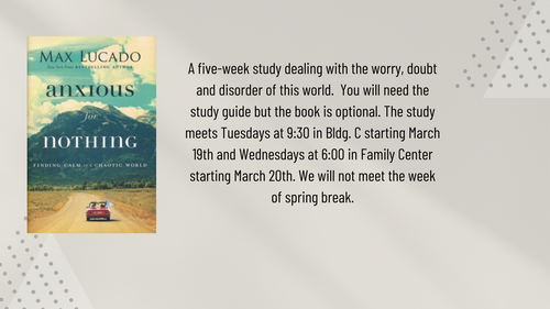 Our next Widows' Ministry luncheon will be Thursday, March 7th at 11:30 in the Fellowship Hall. The cost is $10 per person and sponsors will call for reservations.
