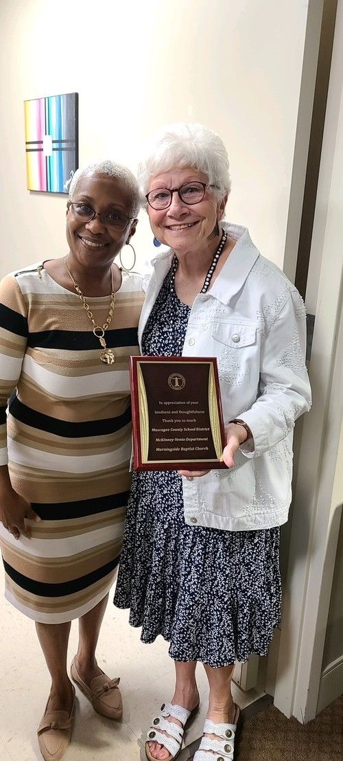Our Ladies’ Bible Fellowship class was recently recognized for their donations to the McKinney-Vento Department of the Muscogee County School District. The McKinney-Vento Department assists homeless children with clothing, food and school supplies. Pictured is Diane Padgett accepting the plaque.